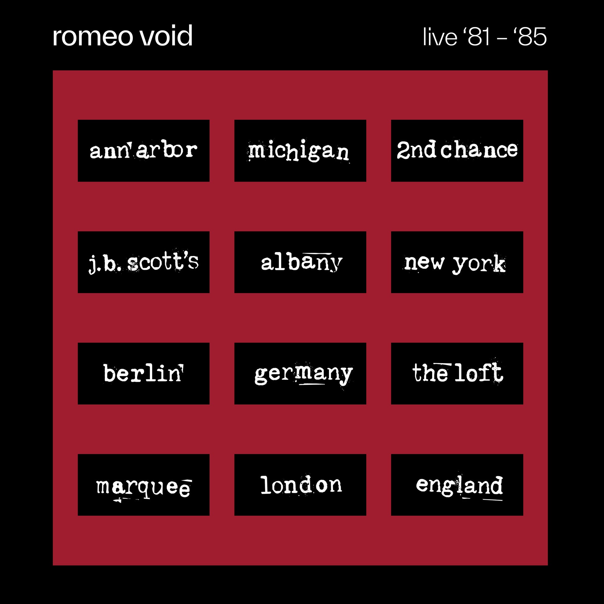 San Francisco-based post-punk/new wave band Romeo Void actively toured the world throughout their early 1980s career. This double-LP set compiles some of the band's best performances from their personal recording archives. Features eighteen tracks from their three studio albums including the alternative radio hits, "Never Say Never" and "A Girl In Trouble (Is A Temporary Thing)” along with fan favorites "Chinatown", "Instincts", "White Sweater" and others. The tracks are compiled from four different dates starting in Albany, New York in 1981, Ann Arbor, Michigan in 1982 and two from their 1985 European tour in Berlin and London. The album is packaged in a gatefold sleeve with rare images from the band's personal collection of photos and memorabilia. The artwork was designed by band members Deborah Iyall and Frank Zincavage.